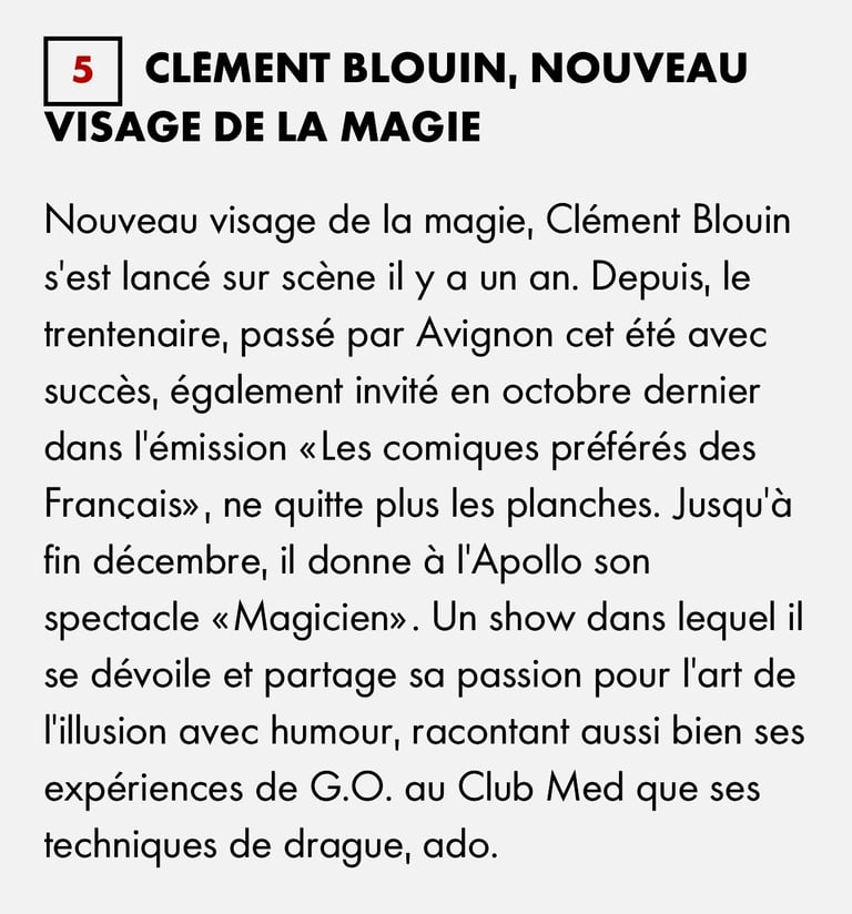En 2022, Clément co-écrit son premier spectacle d’humour et de magie avec Nicolas Genevaz et Thomas Caruso Aragona destiné au grand public et le joue un an à Paris au Théâtre des Mathurins et à l’Apollo. S’ensuit un premier festival d’Avignon complet et une tournée dans toute la France.
